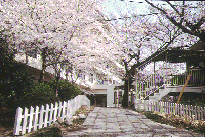 正門を通って、守衛室の前から右手の方をみた風景です。以前に教務部があったこの先には、1996年に改装移転した就職部があります。就職部では学内イントラネットを使って、日々の求人票受付状況が学内のパソコンから確認できるようになっています。